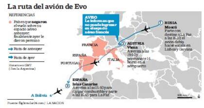 El avión en el que viajaba Morales procedente de Moscú, donde había asistido a una cumbre de países productores de gas, fue desviado anteayer en pleno vuelo, después de que Francia, Portugal, España e Italia le prohibieran que sobrevolara su espacio aéreo.