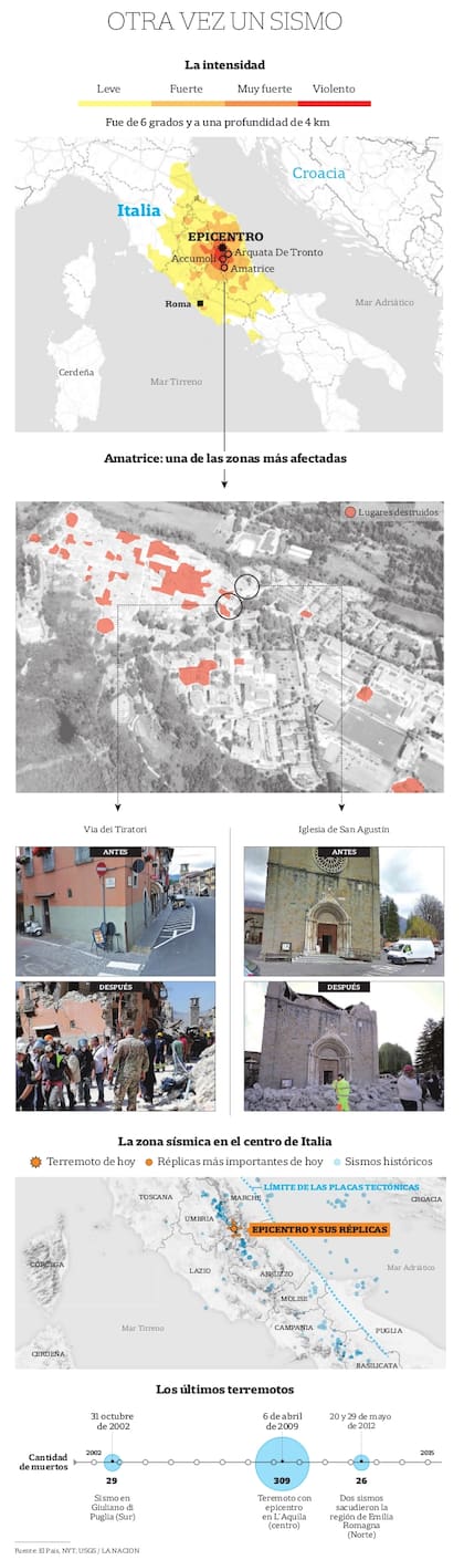 Por su fuerte intensidad y por ocurrir, increíblemente, a la misma hora de la madrugada, el terremoto trajo a la memoria el que destruyó en 2009 la ciudad de L'Aquila, capital de la región de los Abruzos, en el centro montañoso de Italia, que dejó más de 300 muertos. Y, en una jornada en la que todo el mundo siguió las imágenes en directo, que mostraban sobrevivientes, víctimas, iglesias antiguas, casas y barrios literalmente pulverizados, volvió a recordar a los italianos que toda la península se encuentra en un territorio altamente sísmico. En especial, la zona afectada esta vez por el sismo, que, además del Lacio, incluyó Umbria, las Marcas y, en parte, los Abruzos. "Al menos 24 millones de italianos viven en áreas de alto riesgo sísmico, aunque toda Italia está en riesgo", advirtió Francesco Peduto, presidente del Consejo Nacional de Geólogos, que reclamó construcciones de viviendas acordes y "cultura geológica". "Entre el 20 y el 50% de las muertes, en estos casos, tienen que ver con comportamientos errados de los ciudadanos durante el evento sísmico", explicó.