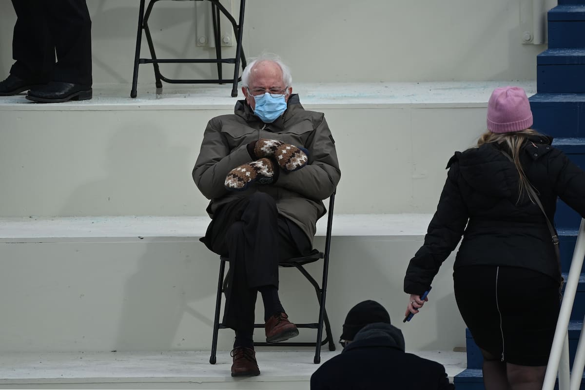 El excandidato demócrata se diferenció entre los presentes porque decidió llevar una campera y un par de guantes manopla ecológicos, que le tejió una de sus votantes. En una de las imágenes tomadas por el fotógrafo de AFP Brendan Smialowski se lo ve sentado, con barbijo, de piernas y manos cruzadas, luciendo sus peculiares guantes.