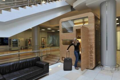 Las "sleepbox" o "cajas dormitorio" son una especie de micro hoteles instalados en algunos aeropuertos que sirven para descansar, navegar por internet y asearse cuando se demora un vuelo o hay una larga escala entre ellos.