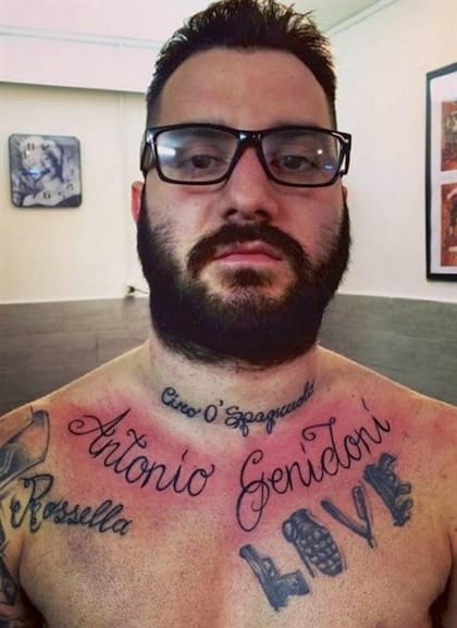 En la parte superior del pecho tiene tatuados los nombres de Antonio Genidoni y de Ciro O'Spagnuolo, otros capos mafiosos asesinados recientemente; la palabra "love", y el nombre de una mujer, Rossella, entre otros dibujos que llegan hasta el brazo. En la espalda tiene tatuado el famoso acrónimo "ACAB" ("All cabs are bastards"), elocuente acusación a las fuerzas de seguridad.