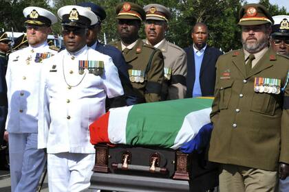 La aparición de la furgoneta negra que llevaba el féretro cubierto con una bandera de Sudáfrica paró los himnos e hizo estallar los gritos de fervor.