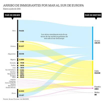 Los sirios, acosados por la violencia en su país y la inestabilidad en los países vecinos, engrosan los números de los migrantes que buscan un futuro en Europa. Fueron 79.655 los sirios que cruzaron por el Mediterráneo desde enero hasta julio pasado, más de un tercio del total, según la Acnur. Detrás de ellos, vienen los eritreos (26.657), que viven bajo una dictadura que los somete a "violaciones sistemáticas, generalizadas y flagrantes de los derechos humanos", según denunció el Consejo de Derechos Humanos de la ONU en junio pasado. Por su parte, 25.556 afganos -agobiados por la inestabilidad política, la inseguridad y los ataques de insurgentes- cruzaron ilegalmente el Mediterráneo en los primeros siete meses del año.