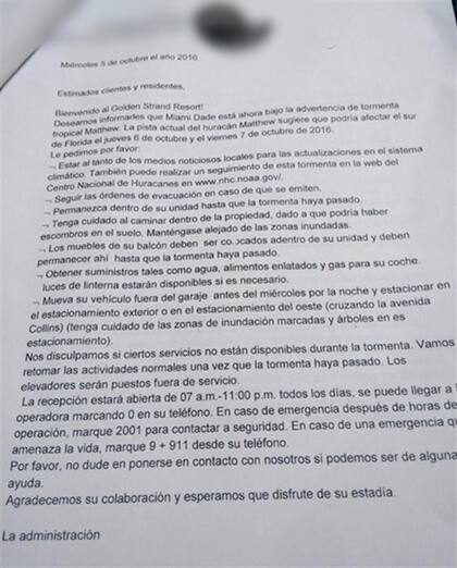 "Nos disculpamos si ciertos servicios no están disponibles durante la tormenta. Vamos a retomar las actividades normales una vez que la tormenta haya pasado. Los elevadores estarán fuera de servicio", agrega el comunicado del hotel a sus huéspedes.