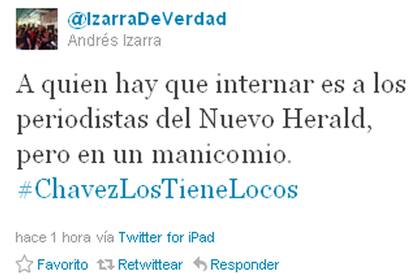 "A quien hay que internar es a los periodistas del Nuevo Herald, pero en un manicomio. #ChavezLosTieneLocos", deslizó Izarra en su cuenta personal de la red social Twitter.