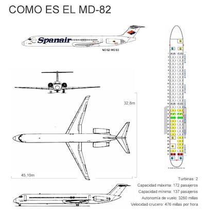El avión que se estrelló es un MD-82 fabricado por la firma McDonnell Douglas y que había pasado una revisión completa en enero. Posee dos hileras de asientos, de un lado con tres espacios y del otro costado con dos. En esta aeronave, las turbinas están sujetas en la parte trasera.