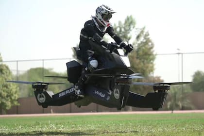 Agentes de la policía de Dubai, Emiratos Árabes, practicaron esta semana maniobras con modelos de Hoversurf S3, una "moto voladora" fabricada en Estados Unidos.