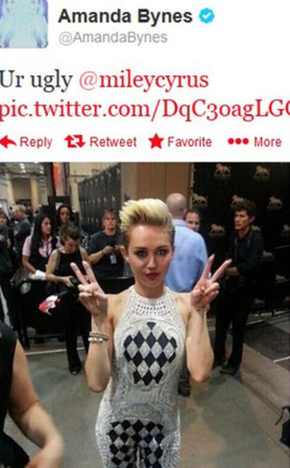 "Ur ugly @mileycyrus." ("Sos fea Milety Cyrus") escribió Amanda en Twitter. Y acompañó su tuit con una foto de reciente de la cantante en los Billboard Music Awards. Luego borró el tuit, pero ya era tarde.