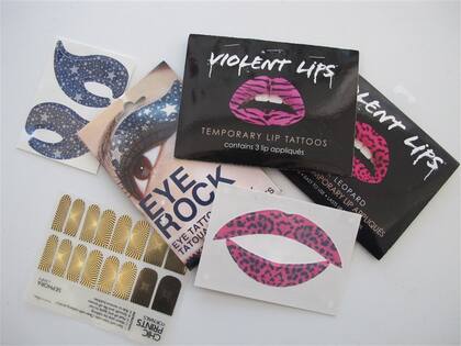 con estrellas, rayas, arcoíris, estampados animales o geométricos, mensajes escritos, purpurina, texturas en colores pastel imposibles de lograr con labiales comunes... Para uñas, ojos y labios, llegan en planchas troqueladas con líneas punteadas en el dorso, como para recortar según las proporciones de cada usuario.
