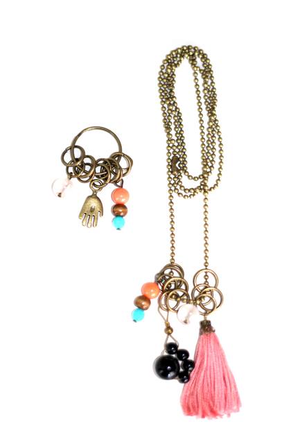 Los dos collares llevan cuarzo rosa, piedra del amor. En el collar humano va un dije de una pata de perro y en el del perro, otro con una mano humana