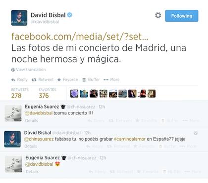 El amor de la China Suárez y David Bisbal ya no es más un secreto a voces, ellos ya lo contaron y lo hicieron público y si faltaba algo... ¡ahora también se mandan tuits de amor! La actriz usa más las redes sociales para compartir su vida y sus sensaciones, él es más rescatado, pero apenas ella le envió un tuit por un comentario que hizo él, la respuesta cómplice no tardó en llegar. ¡Leé lo que se dijeron! ¡Qué viva el amor y que no se enojé Cabré!