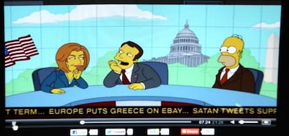 La crisis económica griega. En el capítulo "Políticamente inepto, con Homero Simpson", de enero de 2012, Bart vuelve una estrella de los medios a su padre después de subir a YouTube un video suyo criticando el trato a los pasajeros en las aerolíneas y, al poco tiempo, se convierte en el conductor de un programa. Antes de que eso ocurra, Homero es entrevistado en un noticiero y, mientras transcurre la nota, se puede leer en el zócalo en pantalla la noticia de último momento: "Europa subasta a Grecia en eBay".