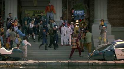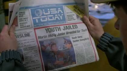 Cuando el Doc le pide a Marty que intercepte a su hijo y modifique el curso del futuro, le muestra un diario que dice que su hijo fue arrestado, enjuiciado y condenado a 15 años de prisión dos horas después del robo. "En el futuro la justicia es rápida y funciona. Eso es porque ya no necesitarán abogados", dice. Algo que evidentemente no ocurrió. Sin embargo, hubo un gran acierto: durante el arresto, se ve que los ladrones son filmados por una cámara sostenida por una especia de dron.