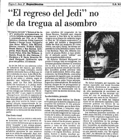 LA NACION ya no necesitaba presentar la historia ni a los seres que poblaban el Imperio Galáctico para el estreno de El regreso del jedi, en 1983, como bien sabía el crítico asignado a reseñar la película. Para entonces, buena parte del planeta esperaba ansiosamente la conclusión de esta "impredecible y bella saga", en la que "todos, buenos y malos, terminan siendo parientes, como en las comedias de Plauto". Quedaba en claro, además, que las innovaciones tecnológicas de Lucasfilm e Industrial Light and Magic –y las memorables imágenes que hacían posibles aquí–serían el camino que tomaría buena parte del cine hollywoodense para cautivar a sus espectadores en todo el mundo.