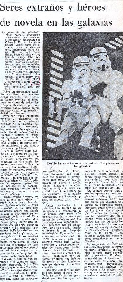 En el caso de LA NACION, la reseña del Episodio IV –sin firma ni estrellitas, como se publicaban entonces todas las críticas cinematográficas–fue mayormente positiva, resaltando la frondosa imaginación de Lucas para el desarrollo de personajes fuera de este mundo, su deuda con el cine de género clásico (el western y el bélico, principalmente) y citando a R2D2 y C3PO como "los dos personajes más importantes" de la historia.