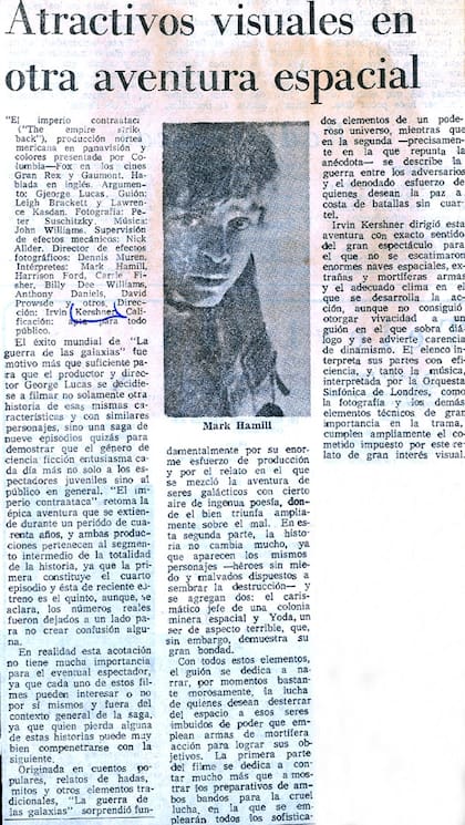 Tres años después, para el estreno de El imperio contraataca, los seres ya no eran extraños sino algunos de los personajes más conocidos de la cultura popular. Ampliamente considerada el punto más alto de la trilogía original –fue escrita por Leigh Brackett y Lawrence Kasdan, quien retornó a ese mundo para el Episodio VII–, este Episodio V fue tratado con bastante menos entusiasmo por este diario, que ya en 1980 se refería a las nueve entregas pensadas por Lucas para contar la historia de Anakin Skywalker y sus descendientes, citando su "morosa" narración y copiosa exposición narrativa como deméritos para la historia. En la que, por cierto, sus actores de carne y hueso tampoco lograron destacarse lo suficiente para ser mencionados por su nombre en la reseña.