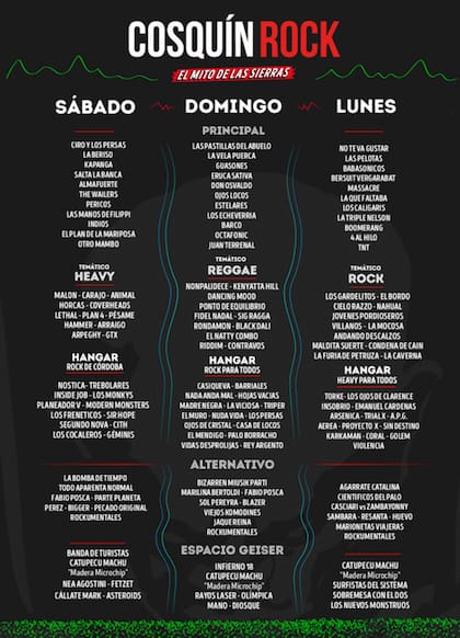 Y la jornada de cierre reunirá a números convocantes como No Te Va Gustar, Las Pelotas, Babasónicos, Bersuit Vergarabat y Massacre, mientras que en el escenario temático Rock tocarán Los Gardelitos, El Bordo, Cielo Razzo, Jóvenes Pordioseros y más.