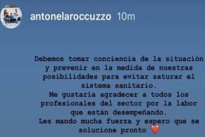 "Debemos tomar conciencia de la situación y prevenir en la medida de nuestras posibilidades para evitar saturar el sistema sanitario", sostuvo Roccuzzo. "Me gustaría agradecer a todos los profesionales del sector por la labor que están desempeñando. Les mando mucha fuerza y espero que se solucione pronto", sostuvo la pareja de Messi en un posteo en el que además agregó un vídeo de la doctora Maria Van Kerkhove, epidemióloga de la Organización Mundial de la Salud (OMS).
