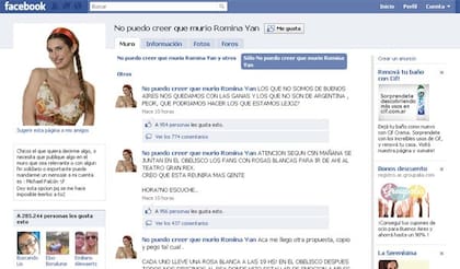 El eco en las redes sociales que tuvo la noticia de la muerte de Romina Yan no tiene precedentes. A una hora de darse a conocer en los medios, el grupo de Facebook llamado " No puedo creer que se haya muerto Romina Yan " ya tenía 150 mil seguidores. Hoy, llega casi al doble y se le sumaron muchas otras páginas similares: " Un ángel llamado Romina Yan ", " Romina Yan siempre en nuestro corazón ", " Por siempre Romina Yan " y " Adiós Romina Yan ", los más populares.