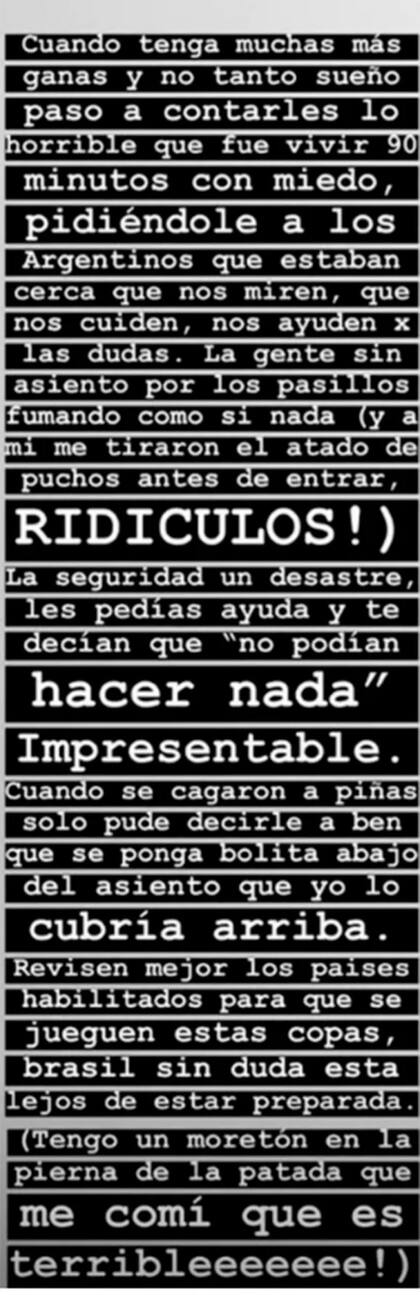 "Tengo un moretón en la pierna de la patada que me comí que es terrible. Fue horrible vivir 90 minutos con miedo, pidiéndole a los argentinos que estaban cerca que nos miren, que nos cuiden, que nos ayuden por las dudas. La gente sin asiento por los pasillos fumando como si nada (y a mí me tiraron el atado de puchos antes de entrar). ¡Ridículos!", contó la joven en sus stories de Instagram.