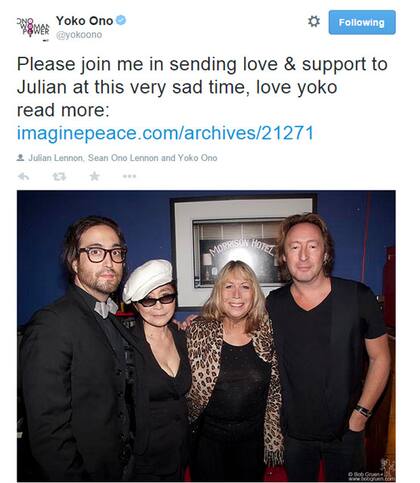 &— Ringo Starr (@ringostarrmusic) April 1, 2015También Yoko Ono, con quien Cynthia mantenía una buena relación, pidió a sus seguidores en la red social que se unieran a ella para "enviar amor y apoyo a Julian en este tristísimo momento".