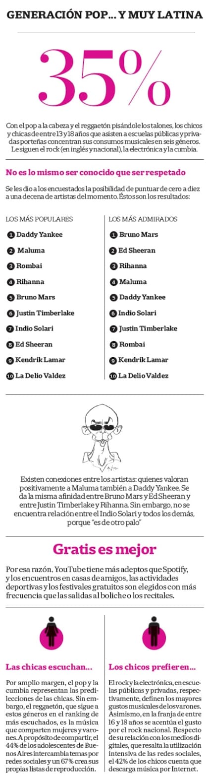 Los hábitos de consumo de los adolescentes tienen su espejo en la lista de artistas más escuchados en Spotify: el portorriqueño Daddy Yankee , conocido globalmente desde 2004 por su hit "Gasolina" y uno de los protagonistas del fenómeno "Despacito" junto a Luis Fonsi , es uno de los artistas mencionados con mayor frecuencia entre los 315 adolescentes encuestados. Sin embargo, hay un dato que llama la atención: esa misma tribu admira más a solistas del pop internacional, como Bruno Mars y Ed Sheeran. "Los más escuchados y mencionados por los chicos son Luis Fonsi, Maluma y Daddy Yankee, entre los latinos, pero los más valorados son músicos globales, como Ed Sheeran y Bruno Mars, que cantan en inglés. Hay una distinción fuerte entre los latinos y los que cantan pop en inglés, a quienes se les asigna mayor importancia. En Buenos Aires hay un imaginario en el que prevalece lo internacional: nos conecta con el mundo", señala la socióloga Ana Wortman, directora del equipo que hizo la investigación Internet, plataformas digitales y gustos musicales de los adolescentes.