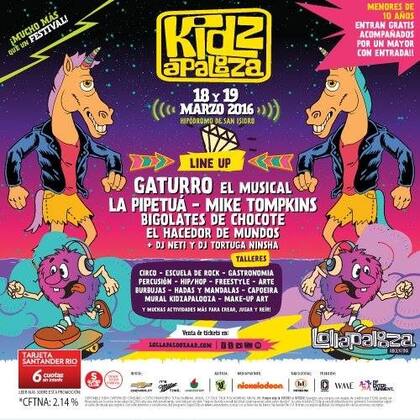 Este año la grilla del Kidzapalooza cuenta con Gaturro el Musical, La Pipetuá, Mike Tompkins, Bigolates de Chocote, El Hacedor de Mundos, DJ Neti y DJ Tortuga Ninsha.