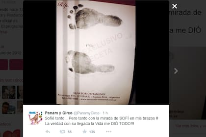 Feliz, Panam confirmó la llegada al mundo de su hija Sofía. La beba nació hoy por cesárea en el sanatorio Otamendi y ambas se encuentran en perfecto estado. La animadora publicó en su cuenta de Twitter el nacimiento de su hija con una foto de la impresión de los pies de la pequeña. Panam, había perdido un avanzado embarazo en 2013, y expresó hoy: "Soñé tanto...pero tanto con las miradas de Sofi en mis brazos!!!. La verdad, con su llegada la vida me dio todo.