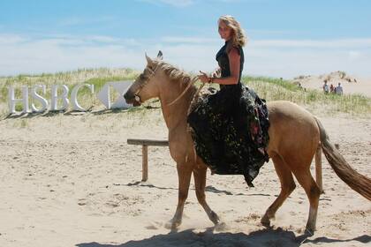 De repente, música y lo que vino, nadie lo esperaba. Fue realmente una sorpresa, y los presentes ovacionaron la idea: las modelos aparecieron cruzando las dunas en caballos, a cuál más elegante. Con las crines brillantes y la cabeza erguida, fueron el complemento perfecto para que las modelos luzcan los vestidos de su última colección, que llamó Dot By Laurencio. En el centro, como cabeza del desfile, la espectacular modelo británica Jodie Kidd, que por estos días veranea en Punta junto a su esposo, el polista argentino Andrea Vianini, y el hijo de ambos. Jodie ingresó secundada por bellezas argentinas: Florencia Fabiano, Sofía Fanego y Cinthia Garrido y Jimena Buttigliengo. Las modelos montadas, que además demostraron ser grandes amazonas, dejaron una postal por de más original. Un lujo que sólo puede darse en estas costas, donde la excentricidad y el glamour están por encima de todo.