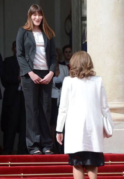 El presidente electo llegó al Elíseo, donde pasó revista a la Guardia Republicana antes de que el presidente saliente le diera la bienvenida en la escalinata del Palacio acompañado de su esposa, Carla Bruni. Fue entonces cuando fuimos testigos de una instantánea que muchos esperaban: el saludo entre la todavía primera dama y la pareja de Hollande, Valérie Trierweiler. La estampa no podía ser más significativa y, una vez más, llamó la atención el estilo informal de la ex modelo y cantante, que antes de dar a luz a la pequeña Giulia era considerada una de las mujeres más elegantes del mundo, y esta vez eligió un sencillo traje oscuro de chaqueta y pantalón, camiseta blanca y chatitas, que contrastó con el cuidado atuendo de su sucesora, que lució un vaporoso vestido de gasa de color negro.