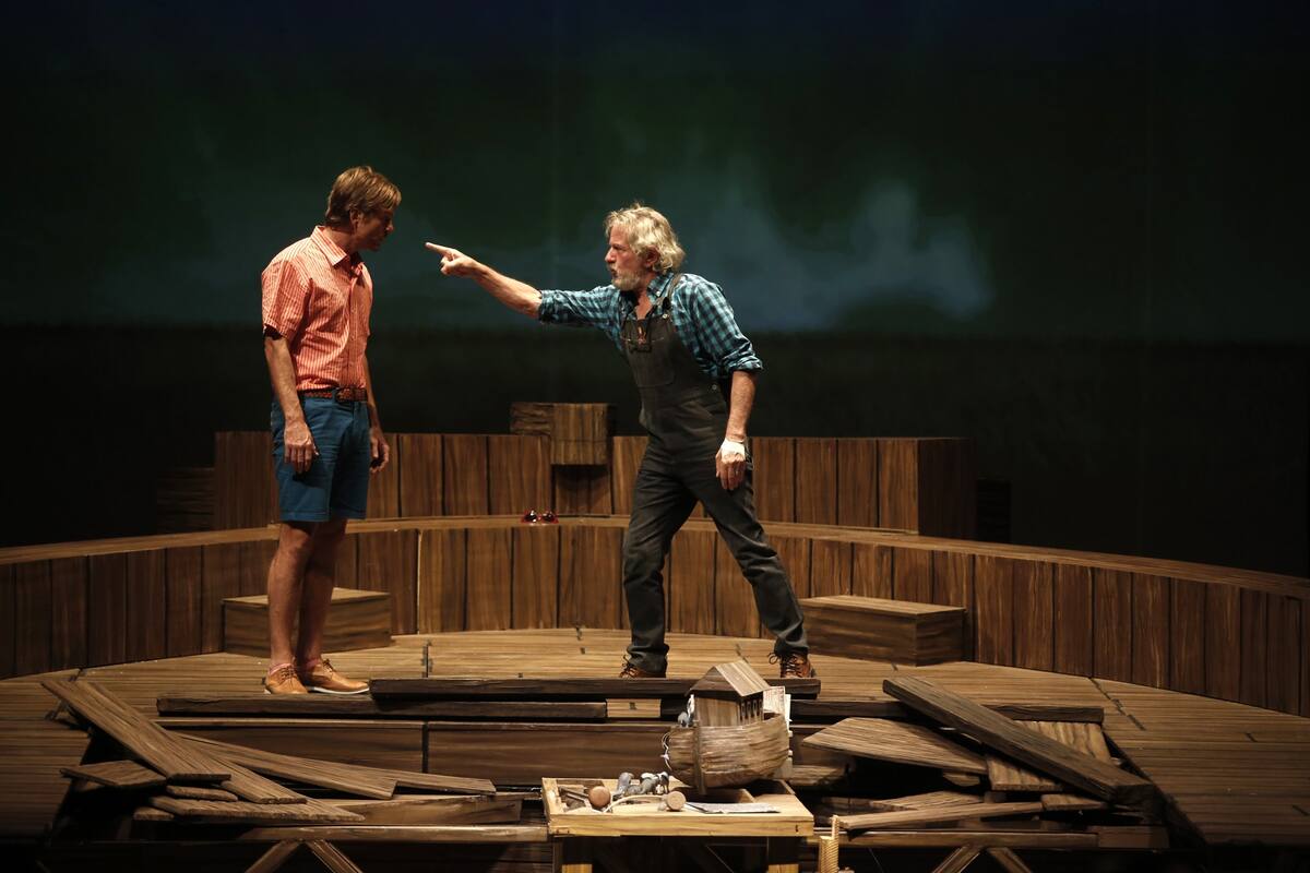 Es una frase común y repetida pero realmente no puede imaginarse otra pareja que la de Pablo Alarcón y Leonor Manso para estos padres pioneros, sensuales, apasionados, tan conectados con las energías vitales: él trabaja sin cesar, reúne a los animales, martilla su barco (cuando suene el tema "La balsa", de Litto Nebbia, de la misma época que estos padres, crea otro momento humorístico), baila, suda, ama y escucha la voz de Dios en esa paloma blanca que se posa en su mano (la paloma es real, entrenada por Charly Viera y Mago Ratsel). "Soy la madre de las madres", dice Manso, radiante con su vestido rojo, una alegría de principio a fin y que, a poco de terminar con su Nidia de Cae la noche tropical en el San Martín, vuelve a contagiar ganas de vivir. 40 días y 40 noches es una muy buena propuesta del Auditorium que, a precios accesibles, ofrece una cartelera aprovechable, donde Cáceres propone un golpe al corazón genuino, sin ningún camino fácil.