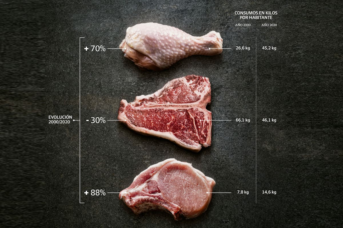 A tono con las palabras del presidente de CICCRA, la carne más consumida a nivel global es la de pollo, luego la de cerdo y muy por detrás viene la vacuna, que siempre es más cara y por eso mismo suele ser considerada como un lujo ocasional pensado para comidas destacadas. Argentina –lo mismo sucede con Uruguay– fue por años la excepción a la regla. Todavía hoy, con 47 kilos per cápita al año, nuestro país ostenta el mayor consumo de carne vacuna en el mundo, si bien la composición de la canasta total de carnes viene modificándose de manera irreversible: mientras que en el año 2000 un argentino promedio comía casi el doble de carne vacuna que de las otras dos carnes sumadas, hoy el consumo de pollo y carne vacuna son muy similares. El cerdo, por su lado, es la que más aumentó de manera relativa, con casi un 90% de crecimiento en veinte años: pasó de menos de ocho kilos a casi quince. “Esto va a continuar”, dice Schiariti. “En 10 o 15 años estaremos consumiendo 35 kilos de carne vacuna, 60 kilos de pollo y posiblemente 35 o más de cerdo”.