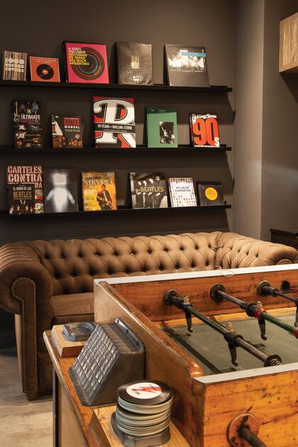 En la oficina del dueño de casa se refleja su pasión por la música. Sobre un sillón Chesterfield, libros especializados (que se complementan con una colección de vinilos y Cds), y el detalle lúdico de un metegol.