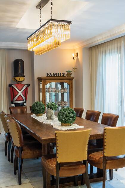 El comedor se ideó a partir de la lámpara de estilo art déco ámbar, y así se eligieron la mesa de madera maciza de olmo recuperada y las sillas de cuero avejentado. Todo bajo la mirada protectora de un Cascanueces fabricado a medida.