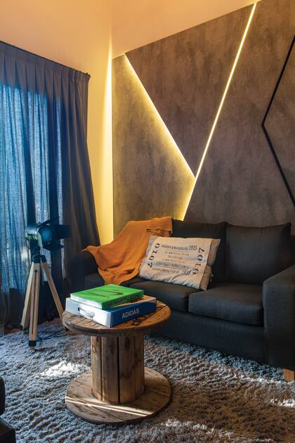 En una de las habitaciones de los hijos, una antesala con mesa de carretel de madera, una lámpara que imita un reflector y un sillón sobre una pared con formas geométricas e iluminada con luces leds