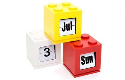 Tres cubos gigantes que forman un calendario de piezas Lego.Para cambiar de día, mes o año, sólo es necesario presionar uno de los encastres ubicados en la parte superior de cada uno de los cubos.