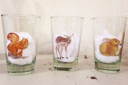 Vasos con animalitos | Los jugos y licuados se sirven en estos hermosos vasos vintage, gentileza de Santa Pulga. Como salidos del bosque, los animales dan vida a la mesa y son del gusto de grandes y chicos.