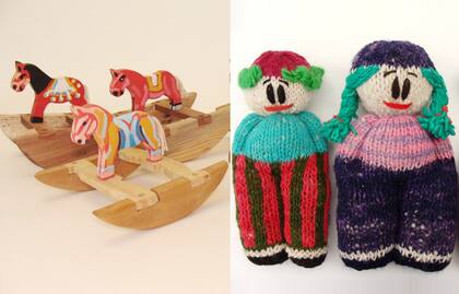 Caballitos mecedores hechos a mano, $69 cada uno. Muñecos o muñecas tejidos a mano, $67 cada uno. |