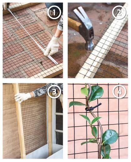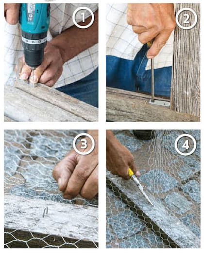 - Cortar la malla a ras y clavarla bien tirante en cada listón, con clavos y grampas.