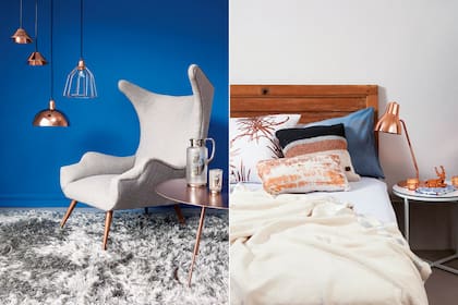 .Der.: 1.En la página opuesta, lámpara cobre ‘Adolfo’, con base de acrílico macizo y madera ($17.000, George Home Couture). 2. alfombra de lana de oveja ($3.065, Elementos Argentinos); 3. lámpara de pie ‘Giant’ ($7.450, Neo Desing); 4. espejo redondo con marco de acero ($7.406, Duveen - Grand Marché).5. sillón ‘Retro 70´ ($9.800, Sixties Furniture); 6. almohadón gris de algodón egipcio 400 hilos ‘DIP’, de 40x60cm ($410, Grand Marché); 7. almohadón con estampa ‘Silver’ ($490, MS Deco); 8. manta de algodón tejido ($1.710, Elementos Argentinos) || Izq.: 9.Pantalla cónica cobreada ($440, Concreto Art); 10. lámpara semi esférica colgante ($960, Concreto Art); 11. lámpara colgante de alambre ($800, Concreto Art); 12. sofá ‘Low’ ($8.300, Sixties Furniture); 13. jarra con dos vasos de sake en cristal labrado ($1.200, Agnes Deco); 14. mesa redonda con tres patas ‘Breeze’ de 50x40cm ($1.600, Decodesing); 15. alfombra ‘Shaggy’ gris de 1,90x2,90m ($6.600, Sodimac).