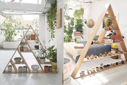 Ni vertical, ni horizontal, ni colgante: ¡triangular! La biblioteca Pirámide de Customs es una buena opción para separar espacios en estudios y monoabiementes sin que queden desintegrados. Está hecha en madera fenólica de 18 mm de espesor, lijada y terminada con laca poliuretánica. Los estantes están encolados y clavados a la estructura y tienen 20 cm de profundidad: pueden elegirse con distintos patrones según el uso que se le quiera dar al mueble (para libros, para macetas, para objetos, etc.). La altura aproximada es de 1,15 metros y el largo de las caras es de 1,30 metros.