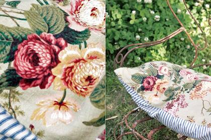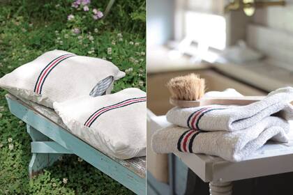 Recortar una sola línea de un estampado y coserla sobre una tela lisa es un recurso sencillo y eficaz para crear un original juego. Acá, un hermoso lino usado como toalla, pero sirve también para fundas, o para tapizar una silla única.