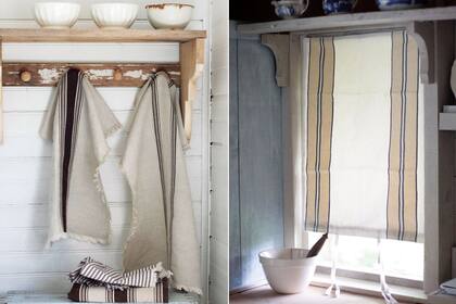 Un individual, un repasador antiguo o cualquier rectángulo de tela puede adornar una ventana como pequeña cortina: basta pegarlo o sostenerlo con chinches arriba, un ruedo que esconda una varilla y dos cintas para enrollarlo. Voilà.