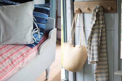 En el perchero de salida, rayas para un chal, pareo o foulard combinado con un lindo bolso de mimbre, listos para transformarnos con su inconfundible espíritu playero en un día de sol cualquiera.