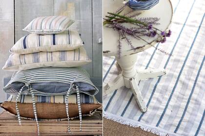 Ya sea para recubrir un áspero almohadón de arpillera o para forrar un pequeño cojín decorativo, el género rayado siempre es un acierto. Mejor aun si, como en este caso, combinamos distintos tipos y anchos de línea, pero engamados.