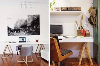 Izquierda: un recurso tan sencillo como montar una madera laqueada sobre dos caballetes puede tomar otra dimensión en compañía de elementos selectos. En este caso, la escalada hacia el refinamiento viene de la mano de la gran obra de Tomás Espina y el sillón tapizado en gris (Mesopotamia), que bien podría estar en un living. Derecha: en un escritorio laqueado con cajones frontales podemos tener todo a mano pero, también, hacer desaparecer el teclado deslizable. Combinado con elementos rústicos, como estos caballetes encontrados en un mercado de pulgas y un sillón vintage retapizado, su practicidad queda envuelta por calidez.