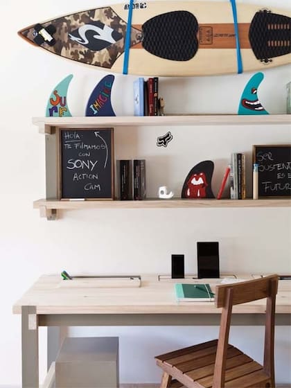 El look bien despejado de este escritorio creado por Talleres Sustentables radica en los detalles integrados en el diseño: pasacables atrás, lapicero incorporado y ranuras para apoyar tablets y teléfonos. Más allá del mueble en sí, que se puede usar el día de mañana en cualquier otro contexto, la impronta fresca está dada por los complementos, como la tabla de surf colgada y las quillas sobre los estantes.