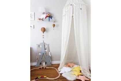 ESCONDITE OFICIAL. Esta mamá usó un simple dosel, lo colgó en una esquina del cuarto y cubrió el piso con mullidos almohadones. Pero la idea se puede adaptar a cada habitación –una carpa, un juego de mesa y sillas, cuatro colchonetas– para darle forma a esa ‘casita adentro de la casa’ donde esconderse, jugar, leer o dormir la siesta.