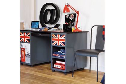 Quizás los muebles que tengas no sean los más originales pero, con un poco ingenio, hasta el escritorio más sobrio puede transformarse. Elegí un estilo (en este caso, el english style) y buscá formas de incorporarlo al mueble (aquí, un poco de pintura sirvió para agregar la bandera inglesa; además, al costado, se pegó un póster con íconos británicos para completar la propuesta. | Foto: