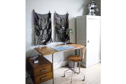 Un escritorio de madera antiquísimo complementado con portaobjetos de tela desmontables. Canchero y fácil de imitar. | Foto: